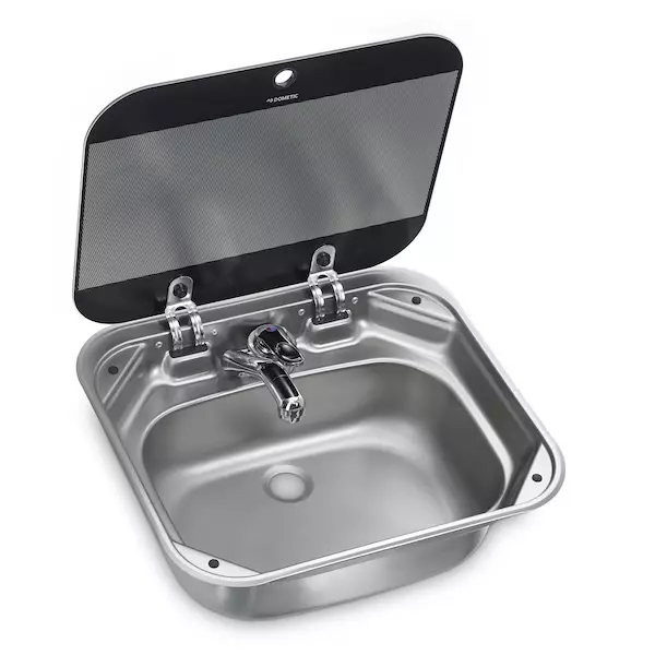 Tyylikäs, neliönmuotoinen upotettava pesuallas on varustettu lämmönkestävästä turvalasista valmistetulla lasikannella ja on erinomainen keittiöratkaisu matkoille.