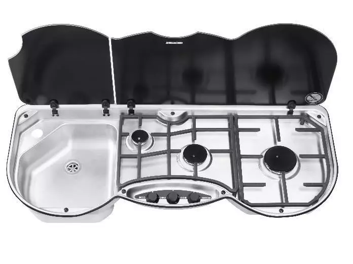 Thetford Series 353 Combination Unit. Mitat: korkeus 160mm, leveys 980mm, syvyys 410mm. 12V sytytys. 30 mbar. Kaasun kulutus max. 353.0 g/h. Vesihanan reikä Ø40 mm.Allas vasemmalla. Altaan sisämitat: korkeus 100, leveys 290, syvyys 321 mm.Viemäriliitos Ø25 mm letkulle. Takareunasta saranoidut lasikannet.Kolme kaasuliettä 1x 1,0 kW, 1x 1,5 kW ja 1x 2,4 kW.