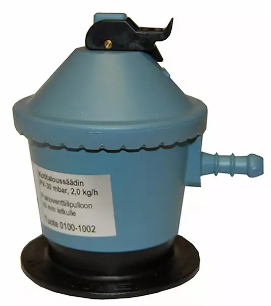 Paine 30 mbar, läpäisykyky 2,0 kg/h. Letkuliitin 10 mm kotitalousletkulle. PV = painoventtiilikaasupulloon. Ns. perinteinen malli, jossa auki/kiinni vipu on paineensäätimen päällä. Ei letkurikkoventtiiliä.