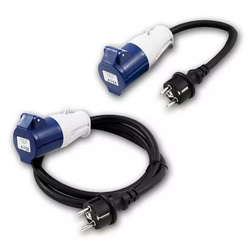 maadoitettu Suko pistotulppa ja toisessa päässä 3-napainen CEE pistorasia (naaras).