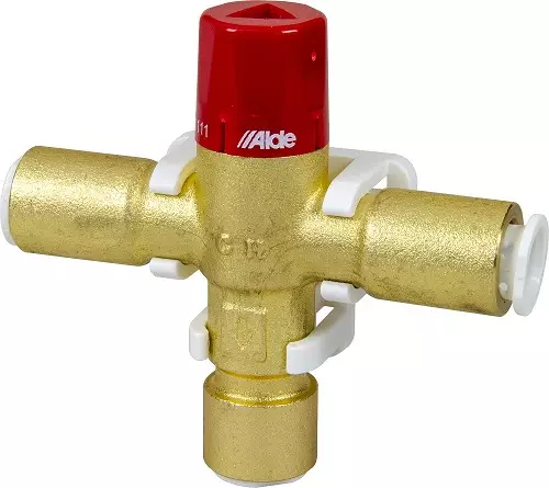 Veden sekoitusventtiili, kiinnitys seinälle. 12mm John Guest liitokset. Venttiilin avulla säädetään veden lämpötila portaattomasti välillä 30 - 48 °C. Venttiilin avulla saadaan estettyä liian liian kuuman veden tulo hanasta tai suihkusta.