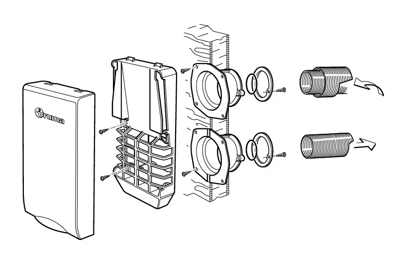 Sarjaan kuuluu seinäläpivienti, pakoputki 1 m, pakoputken suojaputki 0,5 m ja läpiviennin suoja.