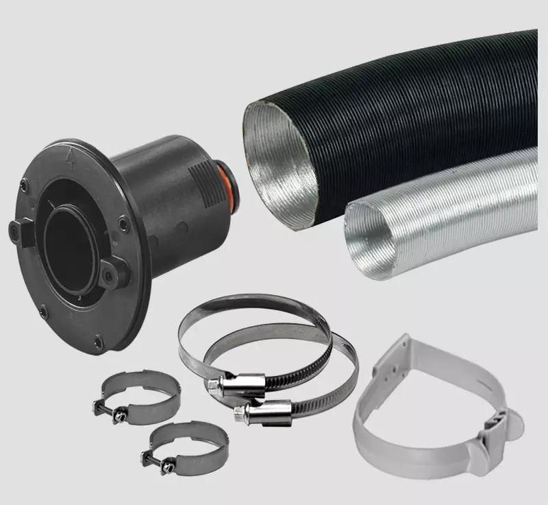 Sarjaan kuuluu seinäläpivienti, pakoputki 1 m ja pakoputken suojaputki 1 m.