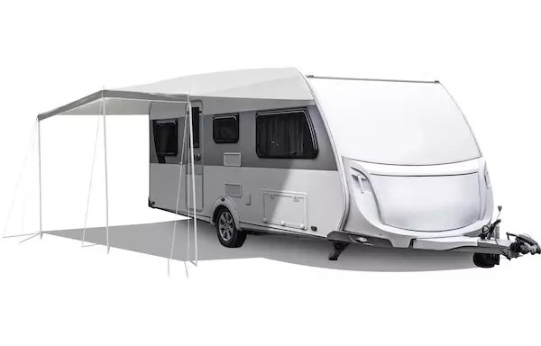 Klassinen matkailuvaunun katos. Myyntipakkaukseen sisältyy tukitangot.