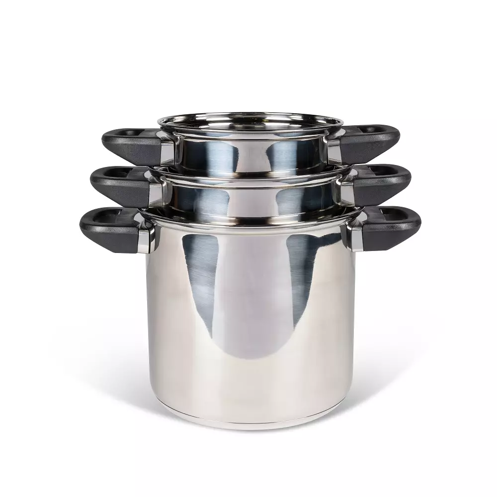 Teräskattilat 14x13 cm, 16x14 cm ja 18x17 cm.