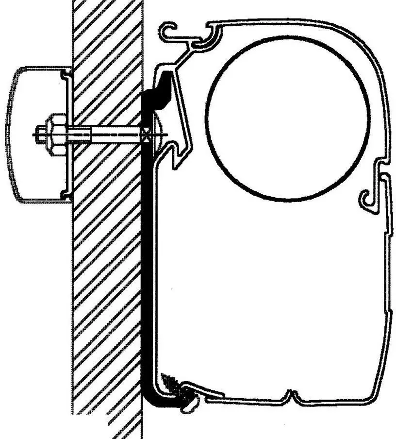 Seinämarkiisin adapteri. Flach Adapter Serie 5 - 4.50m. Vesi ei valu markiisin ja seinän välistä.