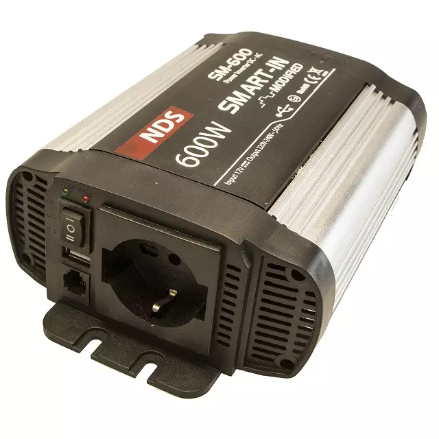 Tekniset tiedot. - Käyttöjännite: 12 V - Teho: jatkuva 600 W / hetkellinen 1200 W - Jännite: 230 V - USB-rasia 5 V / 2,1 A - Mitat: 215 x 140 x 70 mm - Johto 10 mm²/ pituus 80 cm