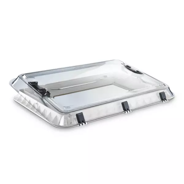 Kattoluukku matkailuvaunuihin. Tämä suuri, avattava kattoluukku päästää raittiin ilman ja auringonpaisteen sisään, mutta pitää hyönteiset ulkona! Erikseen säädettävät hyttysverkko ja pimennysverho tarjoavat lisämukavuutta.