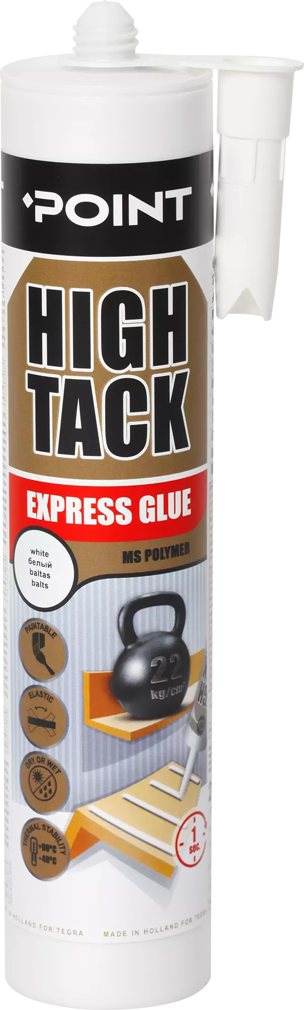 FI Point High Tack on korkealaatuinen MS Polymeeriin perustuva liima, jolla on erittäin korkea alkutartunta. Tarttuu täydellisesti ilman pohjustusainetta useimille, jopa kosteille pinnoille, Elastinen, kutistumaton, ei syövytä metalleja, ei sisällä liuottimia. Pakkasenkestävyys kuljetuksen aikana -15c asti. Käyttöohjeet. Pintojen on oltava puhtaita ja rasvattomia. Levitä liima tiivistyspistoolilla ja mikana toimitetulla V-suuttimella pystysuorina raitoina 10-20 cm välein. Korkean alkulujuuden vuoksi tukea ei yleensä tarvita kovettumisen aikana. Ei sovellu pe-, pp, pc-, pmma-, ptfe-, neopreeni ja bitumipitoisiin alustoihin