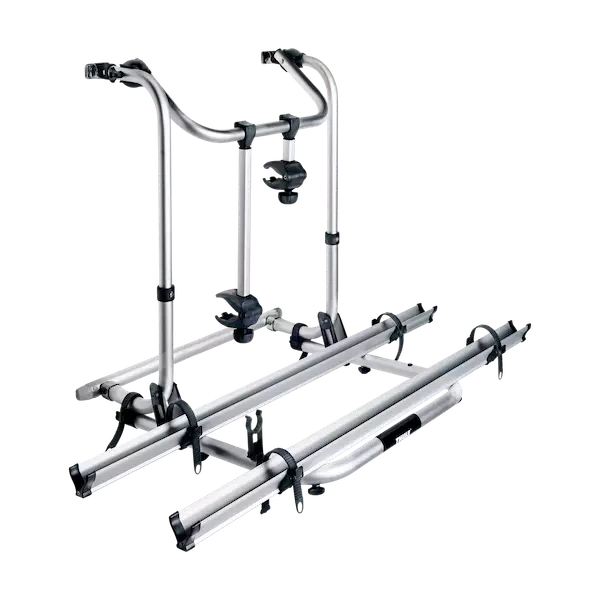 Thule Sport G2 Short. Polkupyörätelineen asentaminen onnistuu helposti ja tukevasti matkailuauton tai asuntovaunun takaosaan. Tämä teline kestää jopa 50 kg:n kuorman ja sen lukittava alusta estää polkupyörien liikkumisen kuljetuksen aikana. Kiskoa voi säätää tarpeen mukaan vasemmalle tai oikealle, ja pyörät liukuvat vaivattomasti paikoilleen, joten voit löytää parhaan asennon polkupyörille. Telineessä on myös uudet pyöränpidikkeet, joihin voit ostaa lisävarusteena lukot. Tämä teline sopii kaikkiin valmiiksi asennettuihin kiinnityspisteisiin (paitsi Hymer). Telineeseen on saatavilla myös kolmas kouru ja pyöränpidin, jolloin siihen mahtuu yhteensä 3 polkupyörää.