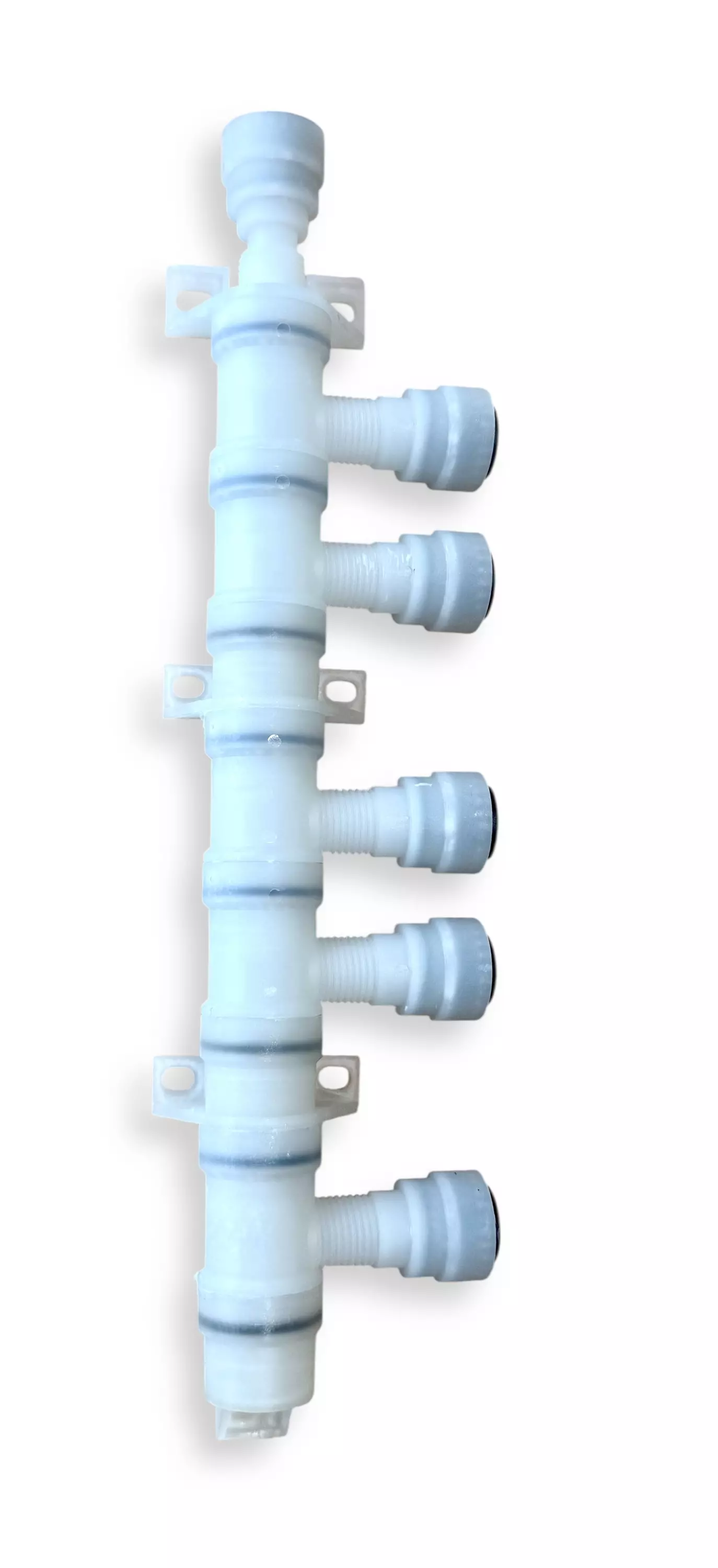 Vesijärjestelmän viisiosainen jakokappale 12 mm John Guest kovaputkiliitännöillä.