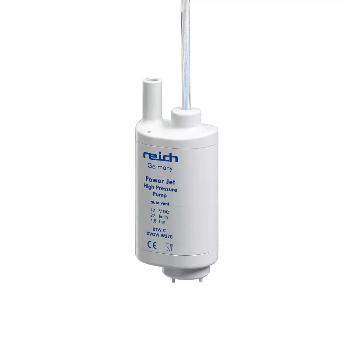 Reich Power Jet uppopumppu UniQuick-liitos Tekniset tiedot: - Maksimipaine: 1,8 bar - Jännite: 12 V - Teho: 22 l/m - Tankki: 55 mm - Virrankulutus: 70 W - Letkun pituus: 100 cm... Lue lisää